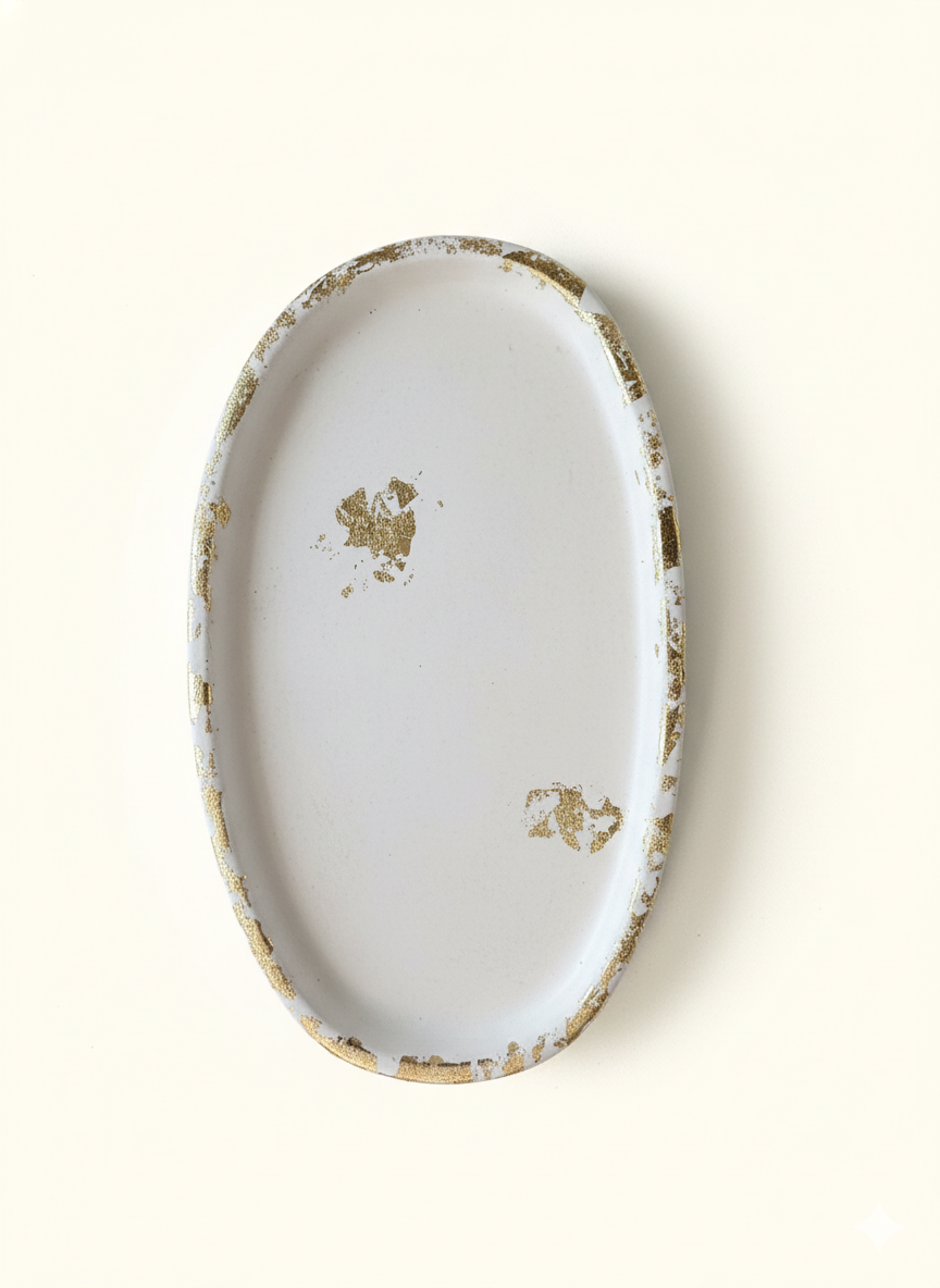 Una pieza artesanal que realza la elegancia de tus velas Cassa Solem. Su diseño ovalado con destellos dorados refleja la luz con sutileza, creando un efecto cálido y sofisticado en cualquier espacio. Ideal para acompañar velas, centros decorativos o como acento en tu mesa, repisa o rincón favorito.